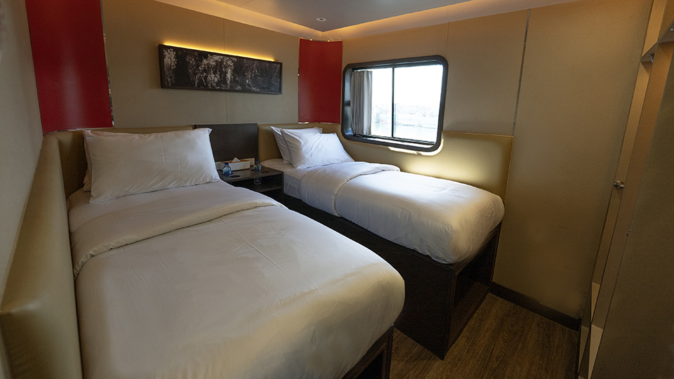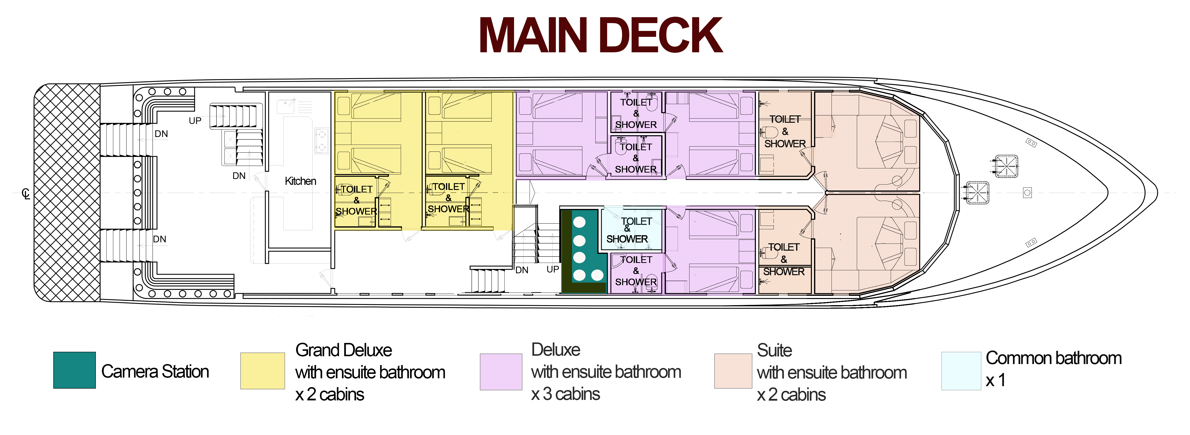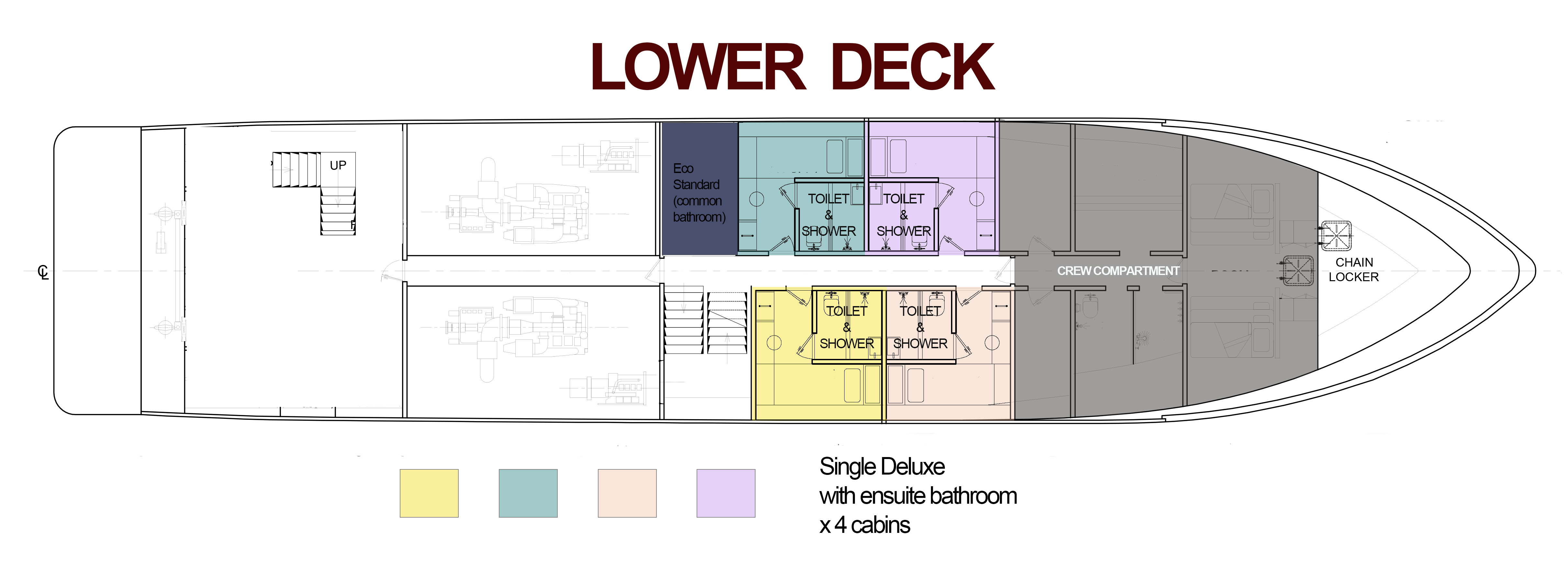 Accommodating just 18 guests in 11 well-appointed cabins—2 Suites, 4 Single Deluxe, 2 Grand Deluxe, and 3 Deluxe—she offers the perfect balance of comfort and privacy. Every cabin features a brand-new ensuite bathroom, with interiors fully refurbished from ceiling to floor to ensure a modern, relaxing atmosphere.
